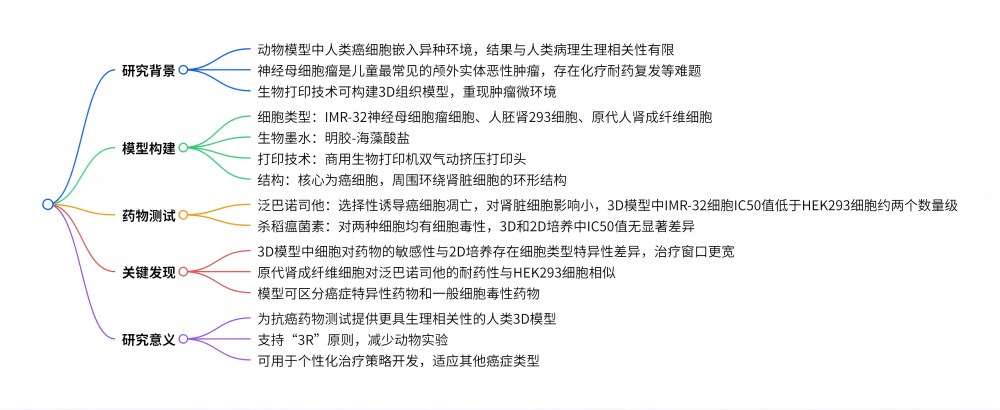 研究人員利用生物打印技術(shù),構(gòu)建了由 IMR-32 神經(jīng)母細(xì)胞瘤細(xì)胞(含 MYCN 和 ALK 基因擴(kuò)增)與人胚腎 293 細(xì)胞及原代人腎成纖維細(xì)胞組成的腎臟微環(huán)境 3D 模型,該模型通過(guò)商用生物打印機(jī)的雙氣動(dòng)擠壓打印頭制作。實(shí)驗(yàn)中,泛巴諾司他(一種組蛋白去乙酰化酶抑制劑)在有效濃度范圍內(nèi)可選擇性誘導(dǎo)癌細(xì)胞凋亡,且不影響腎臟細(xì)胞,而殺稻瘟菌素對(duì)兩種細(xì)胞均有細(xì)胞毒性。此外,2D 和 3D 培養(yǎng)的細(xì)胞敏感性存在細(xì)胞類(lèi)型特異性差異,3D 模型的治療窗口更寬,證明了人類(lèi) 3D 模型在抗癌藥物研究中的價(jià)值,此模型可用于測(cè)試新抗癌藥物的細(xì)胞毒性和腫瘤選擇性,其開(kāi)放支架設(shè)計(jì)還能自由更換腫瘤和微環(huán)境細(xì)胞類(lèi)型。