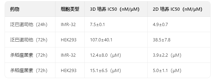 答案:3D 模型中細(xì)胞對(duì)藥物的敏感性存在細(xì)胞類(lèi)型特異性差異,治療窗口更寬。例如,泛巴諾司他在 3D 模型中對(duì) IMR-32 細(xì)胞的 IC50 值比 HEK293 細(xì)胞低約兩個(gè)數(shù)量級(jí),而 2D 中僅低約一個(gè)數(shù)量級(jí),3D 模型更能模擬體內(nèi)腫瘤微環(huán)境,準(zhǔn)確反映藥物在生理環(huán)境中的效果。