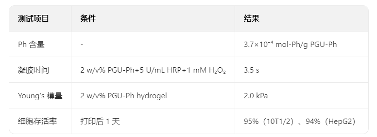 答案:PGU-Ph 在 HRP 催化和 H?O?存在下凝膠化。最佳條件為 2.0 w/v% PGU-Ph 溶液中加入 5 U/mL HRP,在含有 8 ppm H?O?的空氣中擠出,凝膠時間可縮短至 3.5 秒,形成的水凝膠 Young’s 模量為 1.5±0.2 kPa,具有良好的形狀保真度。