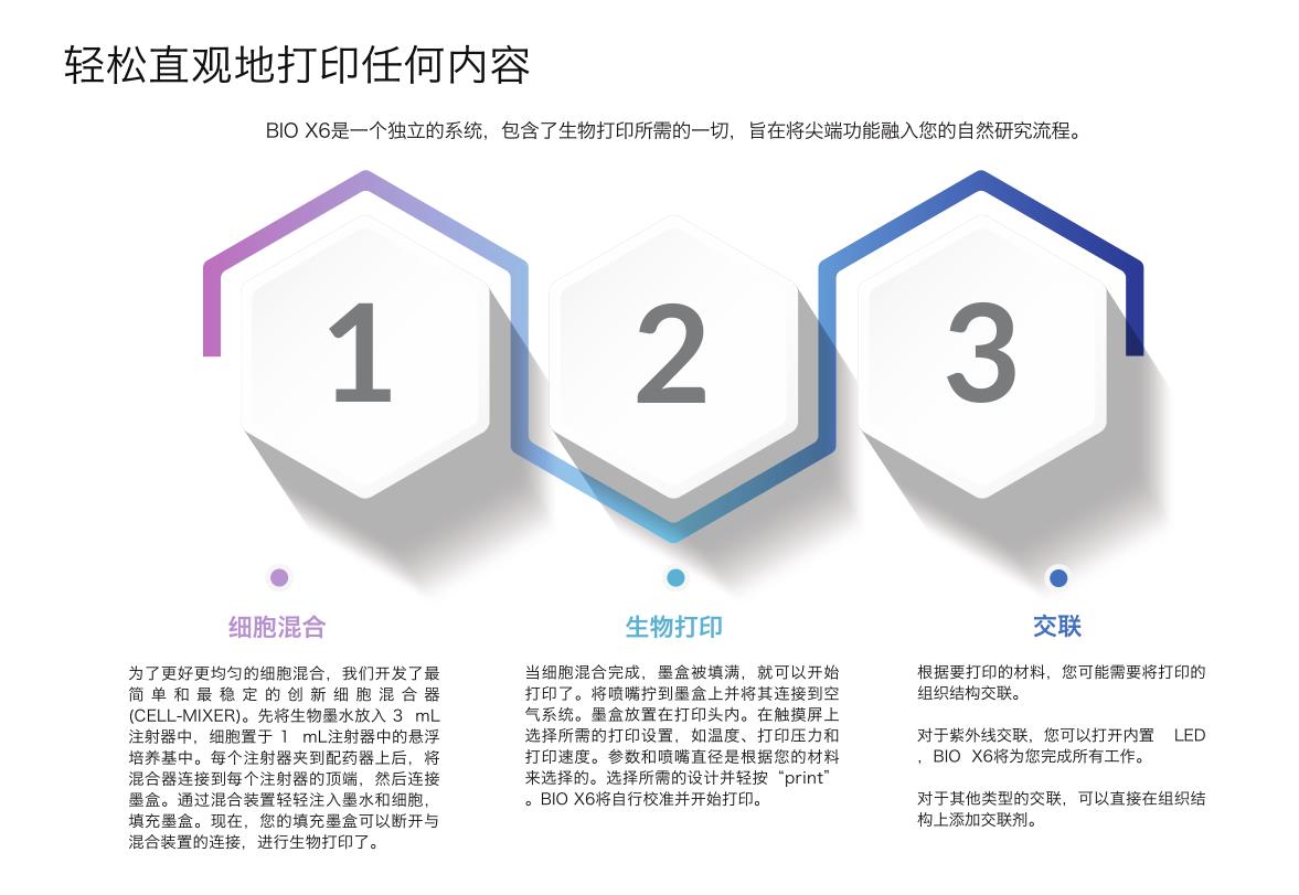 BIO X6 是市場上最靈活的生物打印平臺,擁有六個打印頭,是為創造歷史而生的研究者首選系統。借助BIO X6,您可以比以往更快地組合更多材料、細胞和工具,并更快地獲得結果。及其簡易的操作步驟,只需選擇并裝上打印頭、加載生物墨水并且按下“打印”,BIO X6軟件和自動校準將為您處理其余部分。